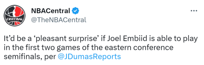 恩比德在首轮对篮网的G3受伤,但他坚持打完了那场比赛,随后他缺席了双方的第4场比赛。保罗-里德在G4顶替恩比德首发,贡献10分15篮板,帮助球队96-88击败对手。前方记者报道称,若恩比德在东部半决赛复出,他的膝盖需要佩戴护具。