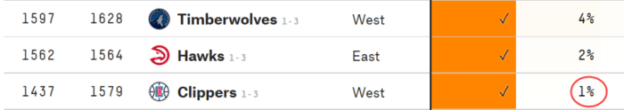 24直播网讯04月26日,NBA安排了三场季后赛大战,快船老鹰森林狼都面临1-3的绝境,其中,快船最不被看好。知名数据网站FiveThirtyEight列出了三队的晋级概率,森林狼4%,老鹰2%,快船最被看衰,只有1%。乔治和莱昂纳德将继续因伤缺席G5的比赛,而在赛前,乔治接受了记者采访,把莱昂纳德称为“战士”,希望威少下赛季能继续留在快船。