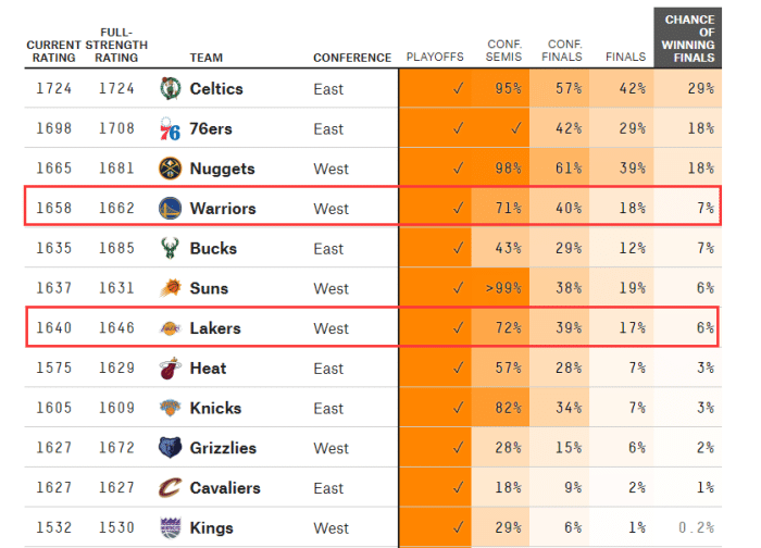 根据大数据机构FiveThirtyEight预测,湖人2-1领先后淘汰灰熊晋级半决赛的概率达到72%,换言之,湖人有72%的概率成功黑七;另外FiveThirtyEight还预测勇士2-2国王后晋级概率达到71%,目前来看,湖人和勇士都很有希望以下克上晋级下一轮,换言之,湖勇有望会师西部半决赛。
