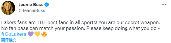 G3一战湖人球迷狂嘘狄龙以及为詹眉等人疯狂庆祝,今日湖人美女老板珍妮-巴斯发推:湖人的球迷是整个体坛最棒的球迷!你们是我们的秘密武器,没有哪家球迷能匹配得上你们的激情,请继续做你们所做的事情,冲呀,湖人!