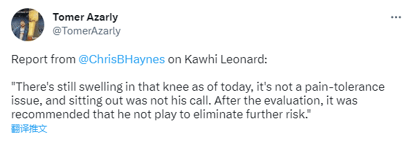 据名记克里斯-海耶斯报道,莱昂纳德已经因为球队所称的右膝扭伤连续缺席两场比赛。他在前两场比赛中的某个时候受伤,我被告知,在G2赛后,他出现了严重的肿胀症状。到今天为止,他的膝部仍有一些肿胀,我被告知,这不是忍受疼痛的情形,缺阵也不是他的决定。在接受评估过后,他被建议不要出战以降低进一步的伤病风险。他没有复出时间表;快船队也不知道科怀何时会回归;快船希望他能在某个时刻回归,但情况看起来并不妙。