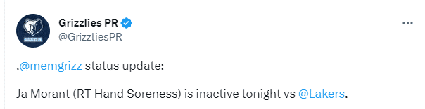 今日赛前,灰熊主帅詹金斯表示莫兰特的伤势好转,将在赛前决定是否出战;之后灰熊官方宣布,莫兰特因伤无法出战G2,莫兰特伤停,湖人大比分2-0稳了吗?