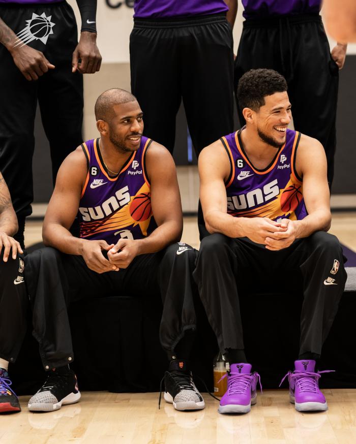 在太阳全队大合影上,太阳教练组成员站在前排两侧,蒙蒂-威廉姆斯站在萨宾-李身旁,沙梅特、佩恩、保罗、布克和奥科吉都站在第一排,其中保罗面带笑容站在中间C位。