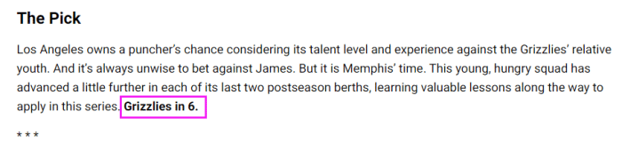 湖人能否在首轮上演黑七奇迹?NBA官网预测湖人总比分2-4不敌灰熊被淘汰出局,官网还列出本轮系列赛的看点,一是詹姆斯和狄龙之间的对抗,二是两队的阵容深度,三是浓眉的表现;此前狄龙曾表示喊话詹姆斯,他们将在首轮淘汰湖人。
