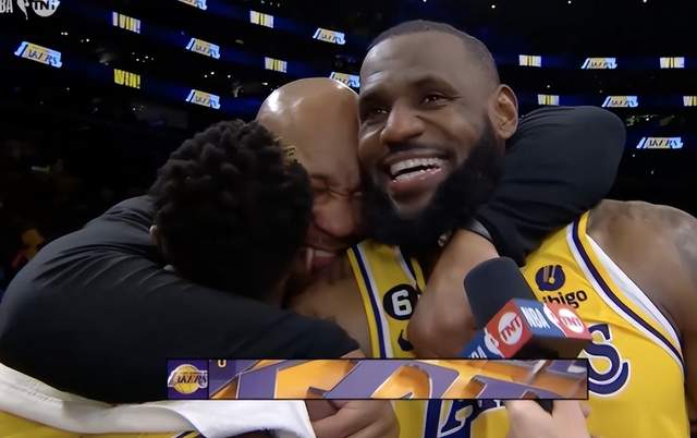 而赛后,湖人主帅哈姆直接熊抱在场边接受采访的詹姆斯和施罗德,令人忍俊不禁。当时詹姆斯和施罗德正要在场边接受采访,此时哈姆直接冲了过来,一手一个搂着詹姆斯和施罗德,并与两人紧紧拥抱。