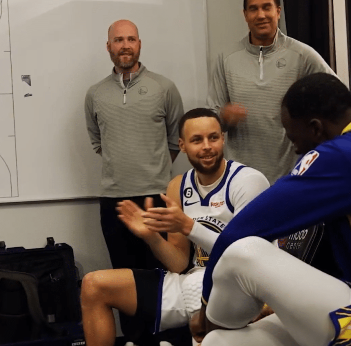 赛后,科尔在更衣室先是和众球员握拳庆祝,之后科尔在更衣室中为三名球员送上纪念球,卢尼获得第一个球,因为他打满了82场比赛并且在进攻篮板方面表现出色,库里、格林等队友为卢尼鼓掌庆祝;克莱-汤普森获得第二个球,因为他本赛季三分命中数突破300记,成为库里和哈登之后又一位达成如此纪录的球员,期间科尔向库里确认了这件事。