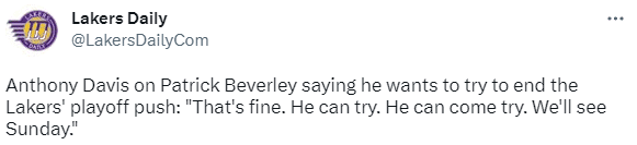 浓眉还霸气回应贝弗利要把湖人踢出季后赛的言论,表示:下一场比赛我们有机会将胜率提高到50%以上,不过你们知道的,贝弗利肯定又要开喷了,他说要把我们踢出季后赛,这会是场很有趣的比赛,他可以来试试,我们看看会发生什么。