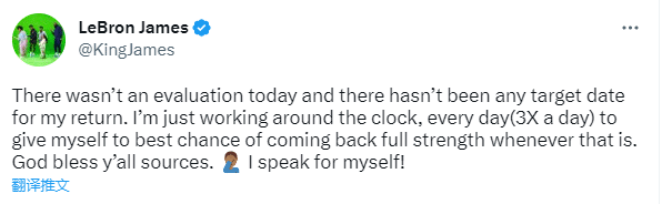 对于外界最后3-4场比赛复出的报道,詹姆斯发推回应:今天我没接受评估,目前我也没有任何复出的目标日期。我只是日以继夜地工作,每天进行三次训练,让自己获得彻底康复的最佳机会。上帝保佑所有那些消息源。我为自己发声!