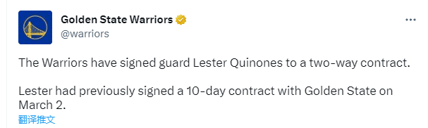 勇士官宣和基诺内斯签下一份双向合同,后者为勇士发展联盟球队出战了44场比赛,场均拿到19.8分6.2篮板3.8助攻,曾单场轰下46分12篮板,从临时工升级为勇士双向球员。