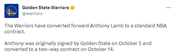 勇士官宣连签2人:兰姆正式转正 15+2卫冕阵容出炉库里克莱领衔