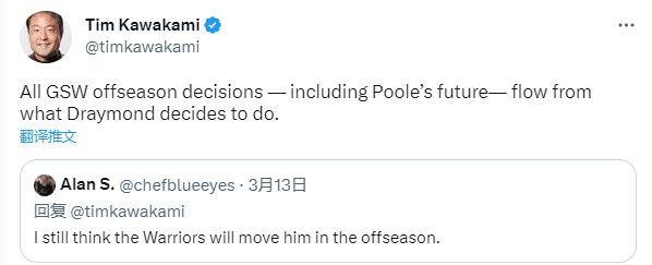 一位球迷表示,他认为勇士今年休赛期可能会送走普尔,对此Kawakami表示:勇士休赛期的所有操作——包括普尔的未来——都取决于追梦的操作。