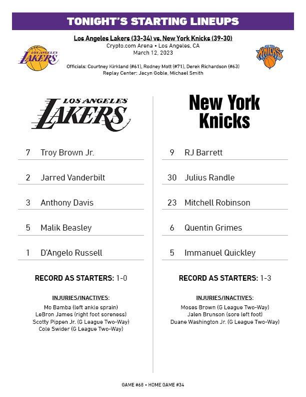 今日对阵尼克斯,浓眉继续出战,湖人首发五虎是浓眉、小布朗、范德比尔特、比斯利和拉塞尔,湖人延续上一场击败猛龙的首发阵容;尼克斯首发五虎是兰德尔、巴雷特、米罗、格雷姆斯和奎克利,布伦森因伤继续休战,进入球队每日伤病名单。