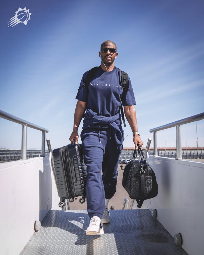 布克身穿连帽卫衣、双手抄兜登上飞机;保罗也是身穿运动装,把外套绑在腰上;艾顿戴着墨镜,还戴着大金链子,他们率队飞往湾区出征客场;杜兰特因脚踝扭伤未随队出征,因伤休战,无缘战旧主。