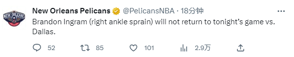 英格拉姆则是遭遇右脚踝扭伤,早早退出比赛,首发上场17分钟,8投5中拿到12分5助攻4篮板;NBA伤病不断,不到1个小时,杜兰特、英格拉姆和东契奇三大球星都因伤退出比赛,在冲击季后赛的关键时刻,球星伤停太影响球队,难怪有球迷调侃这是要报送湖人直接晋级季后赛吗?