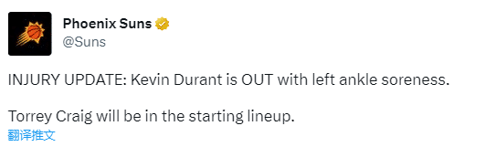 本来太阳已经把杜兰特列入首发阵容,首发五虎依旧是杜兰特、保罗、布克、艾顿和奥科吉,可赛前开打前15分钟,太阳宣布杜兰特因左脚踝酸痛而无法出战,本来今天战旧主雷霆应该是杜兰特太阳生涯主场首秀,因伤退出比赛,太阳主场首秀被迫延迟。