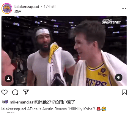 湖人击败灰熊赛后,上半身仅仅穿着紧身衣的浓眉,抱着里夫斯开怀庆祝,并且喊队友的绰号:乡村科比