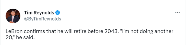 当被问及是否愿意在联盟中待足够长的时间来与布莱斯(詹姆斯二儿子)同场竞技时,詹姆斯笑道:“我不确定自己会打多久,我确认自己会在2043年之前退役,我不会再打20年了。”