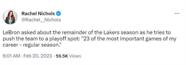 湖人目前27胜32负,排名西部第13位,谈到湖人未来的赛程,詹姆斯表示:“本赛季剩余的23场比赛是我职业生涯中最重要的23场常规赛。”湖人与西部排名第3的国王还差6个胜场,与排名第7的鹈鹕之间还差3个胜场。