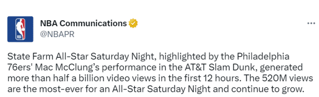 麦克朗扣篮效应!全明星周六之夜观看次数破5亿:创NBA历史新纪录