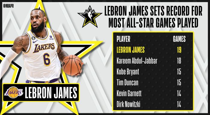 詹姆斯职业生涯第19次出战全明星,超越贾巴尔(18次)成为史上出战全明星次数最多的球员,又创造一项历史第一纪录。