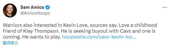 据报道,勇士也有兴趣追求乐福,而且乐福是克莱-汤普森的发小;目前乐福正在和骑士达成买断协议,前者确定离队,想要继续打比赛,乐福主动提出买断请求;双方和平分手的一大原因就是最近几周,乐福跌出骑士的轮换阵容,这为他和球队达成买断安排铺平了道路,以便他能够寻求更好的比赛机会。