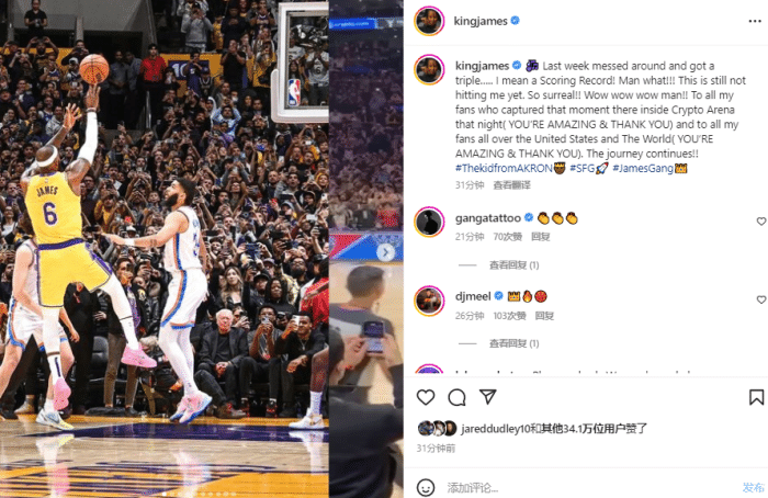 詹姆斯再次庆祝自己加冕历史得分王,晒超越贾巴尔一幕的视频,配文写道:上个礼拜简直像疯了一样,一波三折。我想说的是,那可是得分纪录啊!天哪兄弟们!!!我现在仍感震撼,这不是真的!哇哇哇!!我想对当晚在球馆内举起手机捕捉下这一刻的所有球迷们说一句:‘你们太棒了!谢谢你们!’同时也对我全美以及全世界的球迷们说一句:‘你们太棒了!谢谢你们!’旅程未完待续!!#来自阿克伦的孩子#追逐伟大#詹姆斯帮