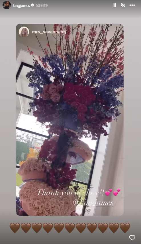 目前詹姆斯在Ins上拥有1.4亿粉丝,全联盟独一无二,在情人节当天,詹姆斯为爱妻定制一束巨型花束,上面插满了粉色和红色玫瑰花,还有郁金香、腊梅等鲜花,这一束花太奢华了。