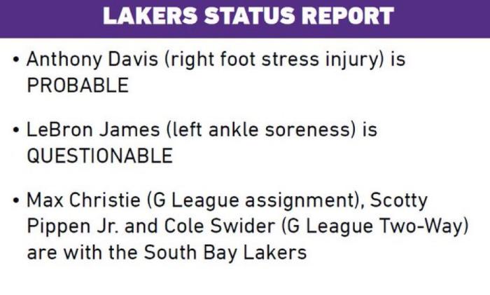 根据湖人最新伤病报告,下一场对阵鹈鹕,浓眉大概率出战,詹姆斯被列为出战成疑,老詹因伤已经连续缺席3场比赛,对阵鹈鹕有可能复出。