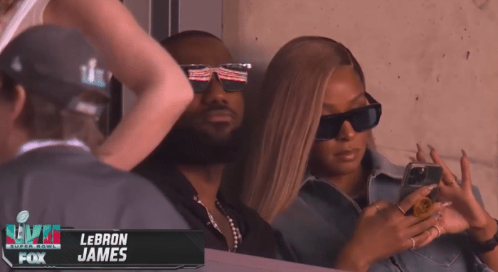 詹姆斯携爱妻现身超级碗:做加冕得分王手势被嘘 转发配上王冠表情