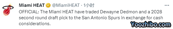 热火官方宣布,球队已经将戴德蒙+一个2028年的次轮选秀权交易至马刺,换来了现金补偿;这一交易让热火队内总薪资比奢侈税线低500万美元。