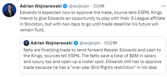 篮网又达成一笔交易,据名记woj报道,篮网把现金和爱德华兹交易到国王,此举是为了腾出一个阵容名额,而且能够节省800万美元的工资和奢侈税,这笔交易需要爱德华兹同意后才能达成,因其合同中含有一年的鸟权限制条款;预计爱德华兹会批准这笔交易,国王队打算给爱德华兹一个机会,让他在发展联盟的附属球队打比赛,但距离交易截止日期还有两天,他的未来将保持不确定。