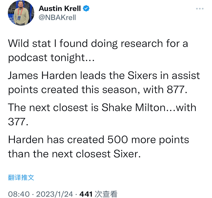 NBA记者的报道显示,哈登本赛季助攻创造得分为887分。而76人队内此项数据第二名米尔顿则是377分。哈登本赛季缺席了16场(伤病和轮休),还比队内第二名多了500分。而哈登场均11.2次助攻,位居联盟第一。