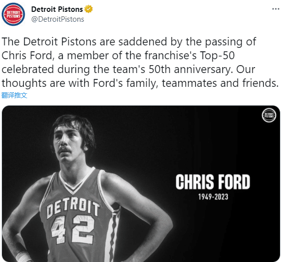活塞队追悼福特,发推:底特律活塞队对克里斯-福特的去世感到悲痛,他是球队成立 50 周年期间庆祝的球队top 50成员。我们与福特的家人、队友和朋友同在。