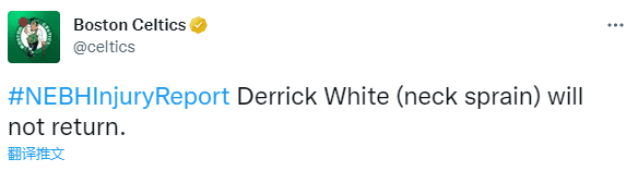 凯尔特人对阵黄蜂第一节,怀特坏冲过来的斯玛特撞到头部,之后怀特捂着颈部十分痛苦,并且倒地不起,塔图姆、斯玛特和霍福德都站在他的身旁,十分担忧队友的伤势;怀特返回更衣室接受检查,最终因颈部扭伤而提前退赛。