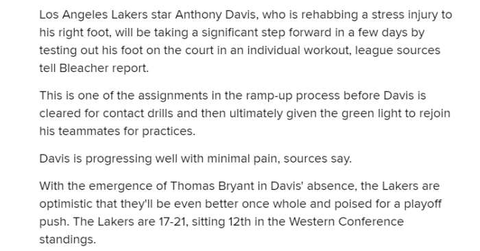 据报道,浓眉的右脚应激伤势恢复比较顺利,只有一些轻微的疼痛感。他将在几天后回到球场进行个人训练,来测试自己受伤的脚反应如何,这是浓眉被允许进行对抗训练前的主要任务之一,湖人短期内的最终目标是让戴维斯能与队友们一起进行对抗性训练。