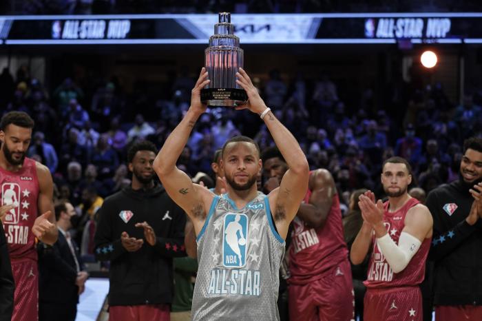 去年克利夫兰全明星赛,库里投进16记三分狂砍50分助詹姆斯队取得5连胜,库里毫无悬念地当选全明星赛MVP,这是库里生涯首次获此殊荣。
