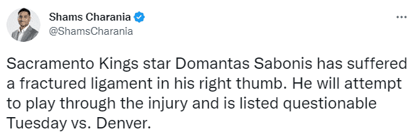 24直播网12月27日讯,据名记Shams报道,国王球星萨博尼斯诊断为右手拇指韧带撕脱性骨折,他将尝试带伤上场比赛,在明天对阵掘金的比赛中列为出战成疑状态。