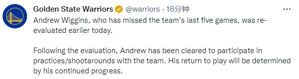 顺便提一下,勇士官方公布维金斯的伤情,官方声明:勇士前锋维金斯缺席了球队最近五场比赛,今天早些时候他在费城接受了重新评估,在评估之后,维金斯被允许参与球队的训练,他能否重返赛场取决于他的进一步恢复情况。