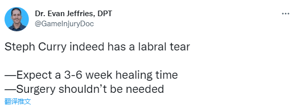 勇士记者Anthony Slater表示外界普遍认为库里将会缺席3-4周,预计他将缺席10-12场比赛。不过另一医学专家Evan Jeffries表示库里盂唇撕裂,预计需要3-6周才能痊愈,不需要接受手术。