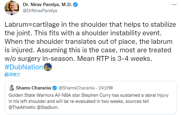 库里因左肩半脱位导致盂唇撕裂而至少缺席2周,医学专家Nirav Pandya表示:盂唇是肩部的软骨,有助于稳定关节;当肩膀移位时,盂唇就会受伤,在这样情况下,大多数人都在赛季中接受了不手术治疗,平均缺席3-4周;但只有手术才能解决持续和不稳定的刺痛。