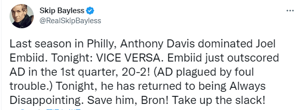 名嘴斯基普-贝勒斯发推:上赛季浓眉统治了恩比德,而今天恩比德20-2统治了浓眉,浓眉陷入犯规困扰,他又回到了令人失望的状态,勒布朗,救救他。