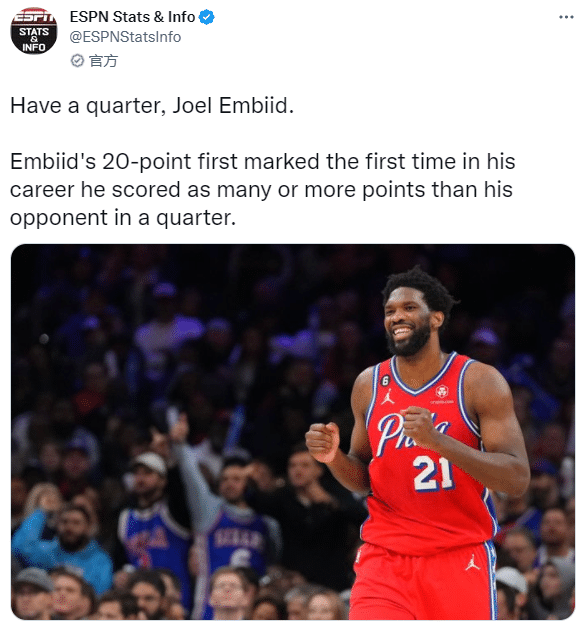 2、恩比德生涯第8次单节20+,排在76人队史第二,仅次于艾弗森(9次做到)