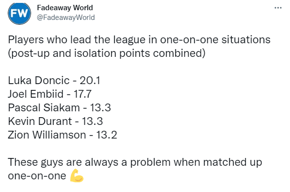 24直播网11月20日,谁是本赛季单打之王?据美媒统计,在一对一单打时,东契奇场均20.1分力压恩比德等人领先全联盟,美媒Fadeaway World配文写道:单挑时,这些家伙都是一个大麻烦。