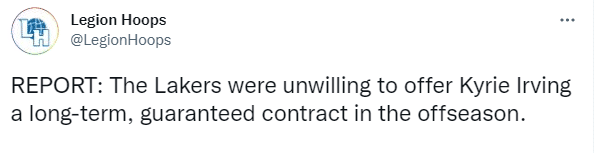 据美媒报道,湖人已经不愿意在明年休赛期为欧文提供一份长期有保障的合同。换言之,湖人对欧文的兴趣正在下降,今年休赛期,湖人曾积极追求欧文,无奈筹码有限无法打动篮网,最终欧文执行球员选项,继续留在篮网。