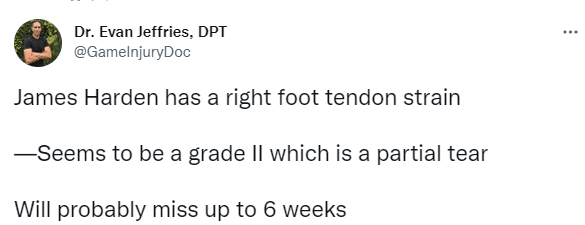 哈登带伤出战仍不敌奇才,检查之后伤情确诊为右脚肌腱拉伤,76人官方表示哈登至少伤停两周,可外界报道他至少伤停1个月;医学专家 Evan Jeffries表示,哈登可能遭遇肌腱二级拉伤,可能缺席6-8周;肌腱的伤病很棘手,何时复出取决于他的肌腱。