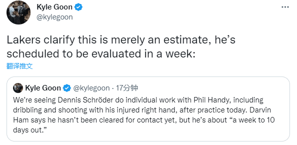 据湖人记者Kyle Goon报道,施罗德今天和湖人助教汉迪一起进行了训练,训练后哈姆表示施罗德还没有进行接触训练,湖人官方表示施罗德将在一周后重新评估伤情。