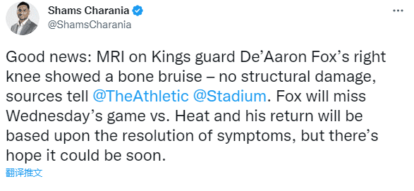 据名记shams报道,国王后卫福克斯的核磁检查结果显示,他的右膝骨挫伤,没有结构性损伤,将错过下一场与热火的比赛,将再瘀伤症状痊愈后复出,预计很快就能回归。