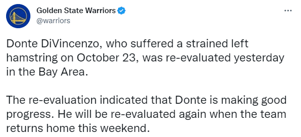 勇士官方更新迪温琴佐的伤情,昨天迪温琴佐在湾区接受了重新评估,他的康复进展良好,当球队结束客场之旅回家时,他将再次接受复查。