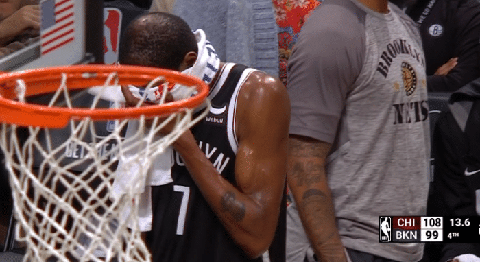 篮网两次领先到两位数,可末节全队突然哑火,被公牛打出17-2的超级攻势,关键追分时刻,杜兰特、欧文都打铁,KD还出现不必要的传球失误,比赛早早失去悬念,欧文枯坐替补席,一脸沮丧和生气的样子,杜兰特则是沮丧地提前离场,比赛还没结束,KD就扭头走回了更衣室。
