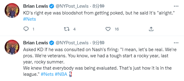 对于纳什下课,篮网是否征求了他的意见,杜兰特表示:让我们面对现实吧。我们是职业的(球员/教练)。我们是联盟中的老人了。我们这赛季的开局很艰难,去年也是,今年休赛期也是动荡不安。我们都很清楚,每个人都会被评估,这个联盟就是这样。